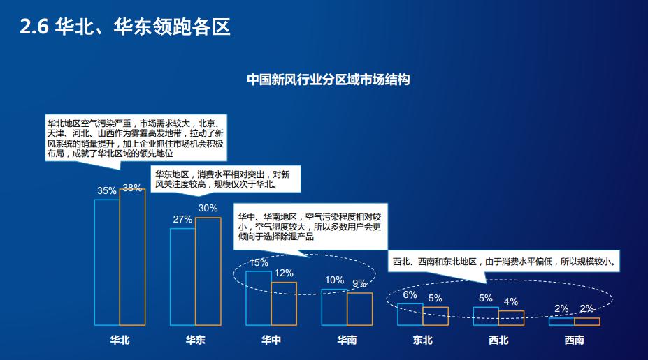 地域市場(chǎng)銷售量排名方面華北、華東領(lǐng)跑各區(qū)。數(shù)據(jù)顯示,華北地區(qū)空氣污染嚴(yán)重、市場(chǎng)需求較大,北京、天津、河北、山西作為霧霾高發(fā)地帶,拉動(dòng)了新風(fēng)系統(tǒng)的銷量提升,加上企業(yè)抓住市場(chǎng)機(jī)會(huì)積極布局,成就了華北區(qū)域的領(lǐng)先地位;華東地區(qū),消費(fèi)水平相對(duì)突出,對(duì)新風(fēng)關(guān)注度較高,規(guī)模僅次于華北。